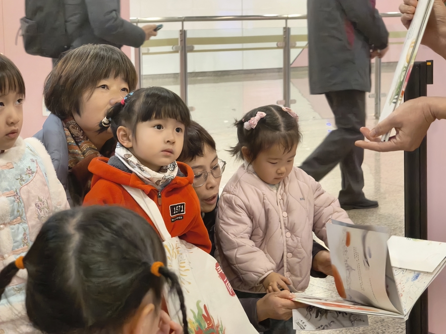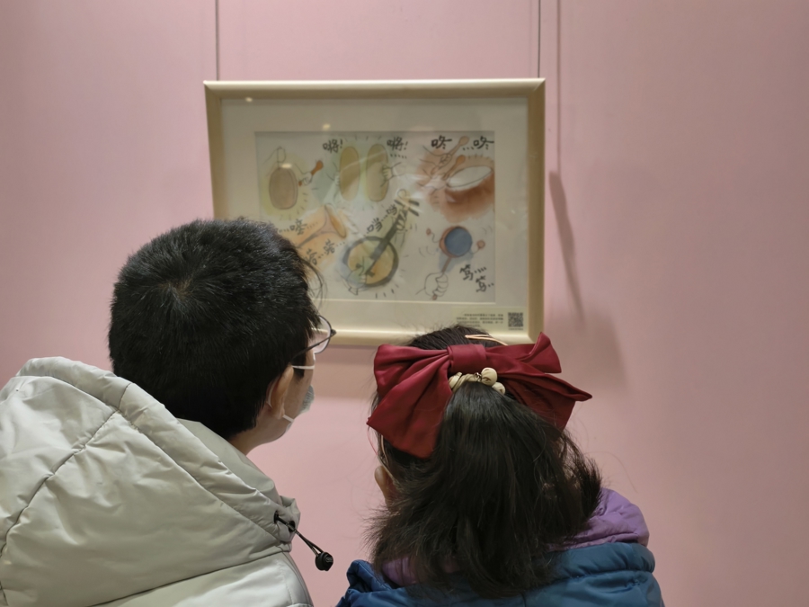 在十五号线顾村公园站的站厅里,《金龙船》绘本主编吴斌荣正带着多组亲子家庭驻足画前,细细讲解一幅幅水墨原稿背后的故事。“让‘大肚皮’的故事,随着地铁运行的脉搏,陪伴市民的每一次出行,”她笑着说道,“正是选择在这里办展的一份初心。”一位共同参观的孩子家长也感慨道:“把‘罗店划龙船’这样地道的非遗故事,用水墨画带到地铁里,让赶路的时间也变得丰富起来。”