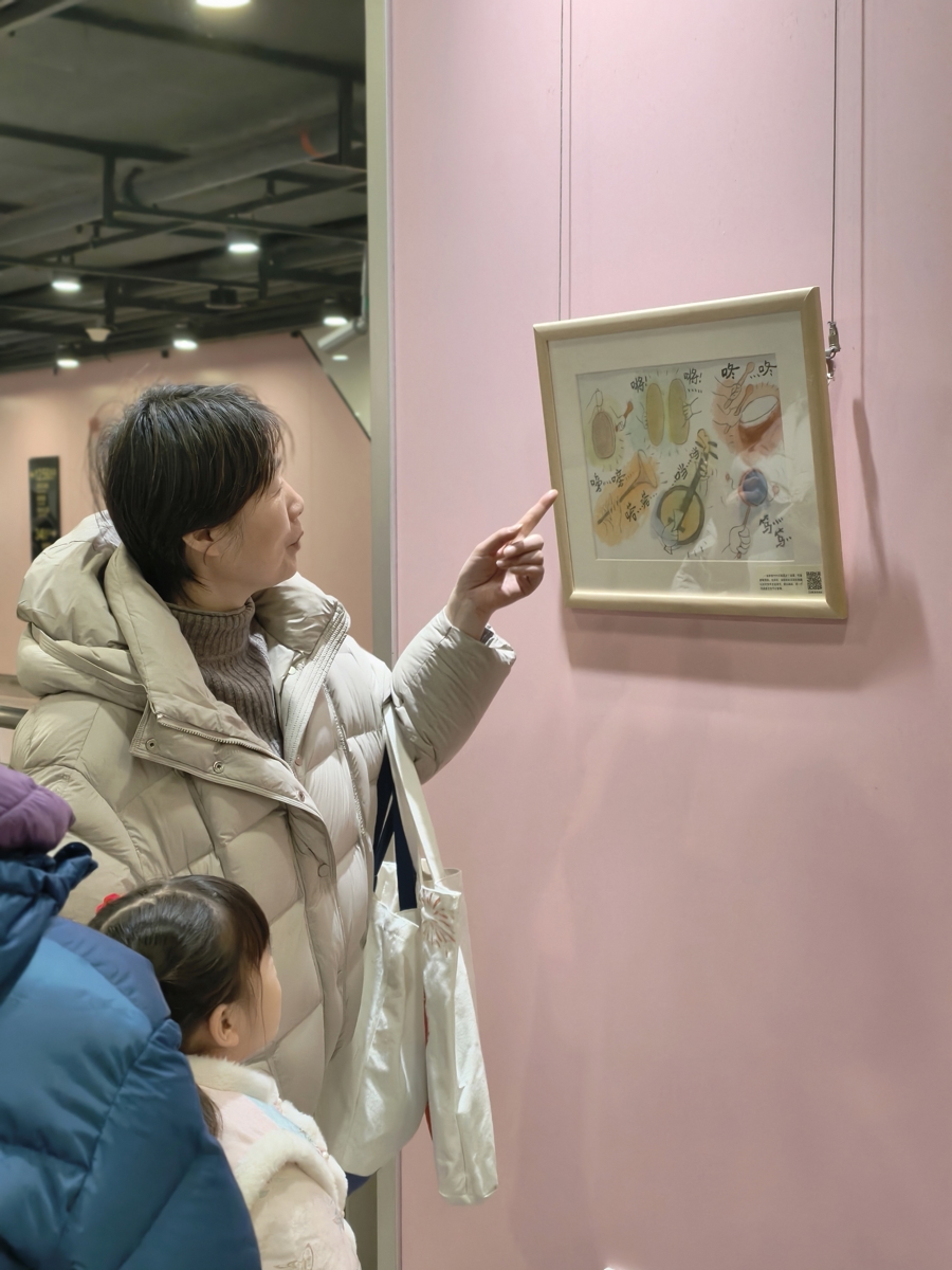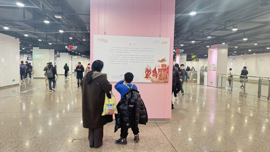 十五号线顾村公园站的站厅里,《金龙船》绘本主编吴斌荣带着多组亲子家庭驻足画前,细细讲解一幅幅水墨原稿背后的故事。“让‘大肚皮’的故事,随着地铁运行的脉搏,陪伴市民的每一次出行。”她笑道。一位共同参观的孩子家长也感慨道:“把‘罗店划龙船’这样地道的非遗故事,用水墨画带到地铁里,让赶路的时间也变得丰富起来。”